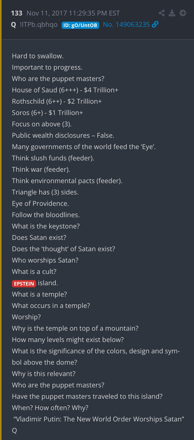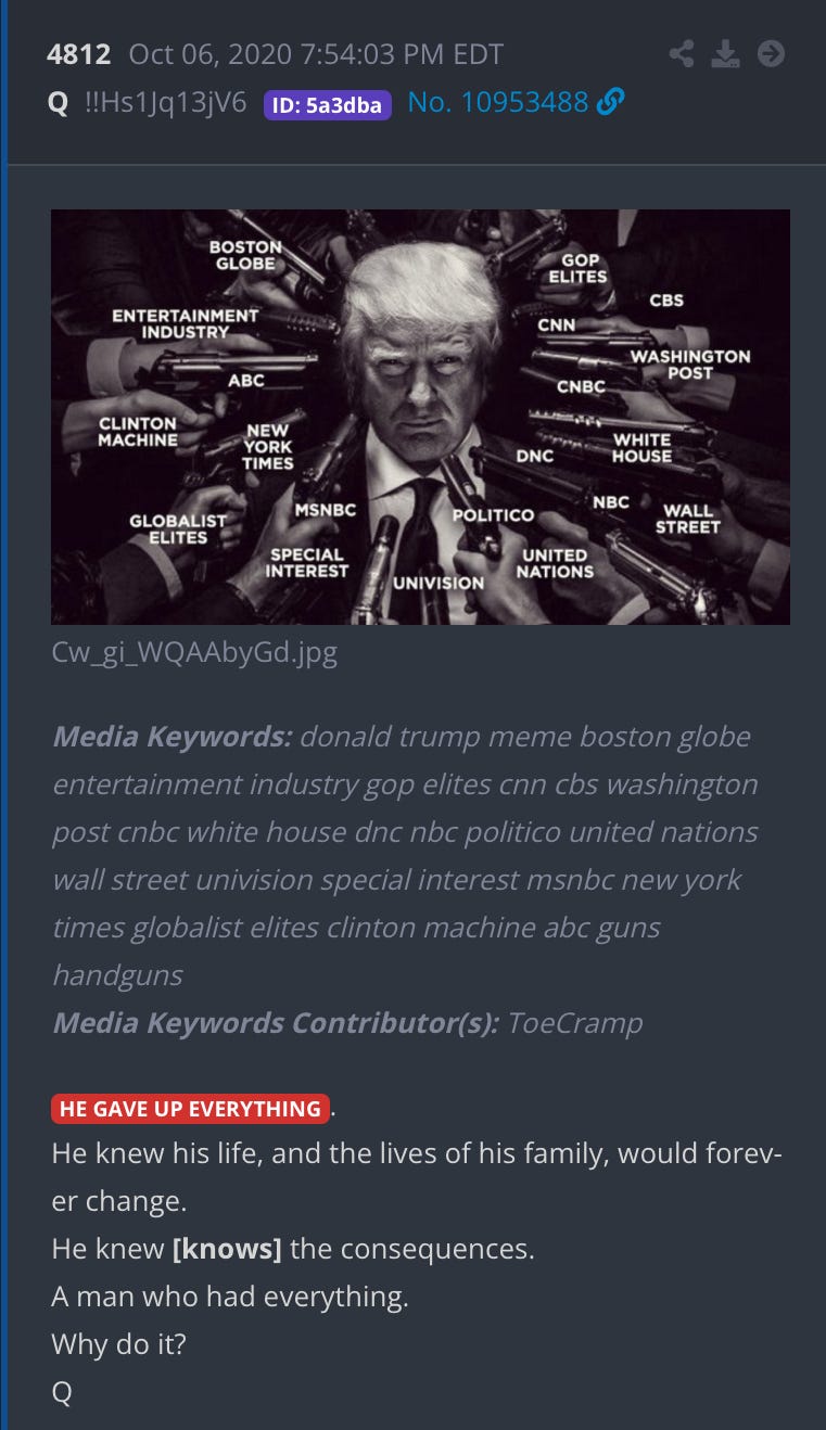 I have to address something I keep seeing on X that is truly unhinged. Some people think they have solved the case of Q by saying Epstein and his friends created Q. I almost don’t want to talk about this because it’s bottom of the barrel slop. I think I should because of how Q is increasingly becoming like a folk lore tale year by year. I think there should be approximately 4 rules when it comes to discussing Q. 1: you cannot discuss Q and be taken seriously if you have not done due diligence in reading a good portion of the posts, and you’ve deciphered the information in some capacity. 2: you cannot form real opinions on Q if you have Trump derangement syndrome. 3: If you refer to Q or anons as “Qanon” it means inherently you lack understanding of the subject. Anyone who has taken this topic seriously knows Qanon is a normie term and that there is an important distinction between Q and anons. Why? Q is a team of high level military and government officials. Anons are just people who have followed the Q posts, or perhaps citizen journalists. 4: you need to have some sort of understanding of the Q proofs. These Q proofs lead to an undeniable confirmation that at the very least Trump and some close to him are involved.