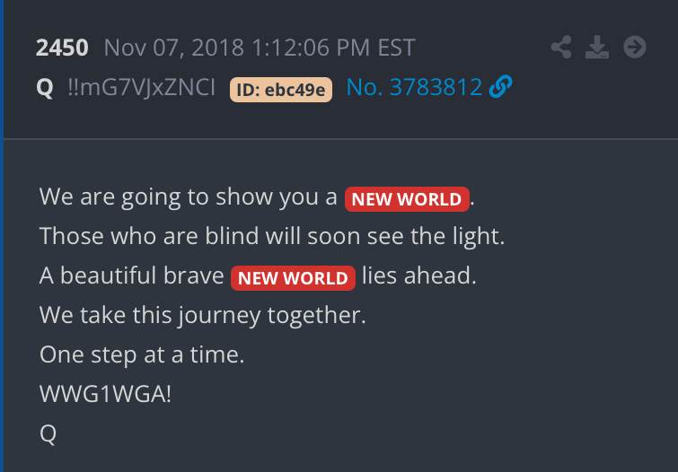 If you look at history, you’ll see God used to flex his strength in big ways to strike down evil, like Sodom and Gomorrah and flooding the Earth. Everything changed when Jesus came in the flesh. He promised to never flood the Earth again. As silly as some people might think the statement is (because people believe God is passive now), I believe Q is a major part of God’s plan for the world. God used Q to save the world. If it were not for Q, the world would look drastically different right now. We would have fallen into the hands of Satan and the New World Order (16-year plan.) In time, I hope the world will understand this deeper. Q said history will look kindly on the anons. Will that include Q, or will Q be a silent hero? I am not sure, but these people have sacrificed a great deal to fight evil.